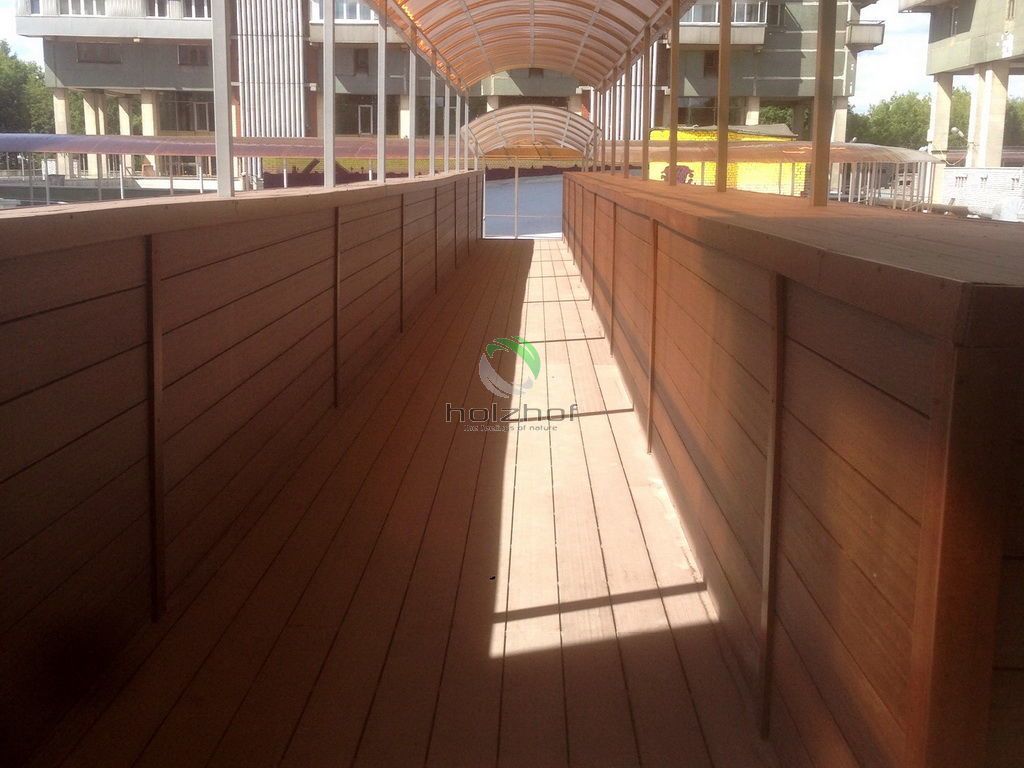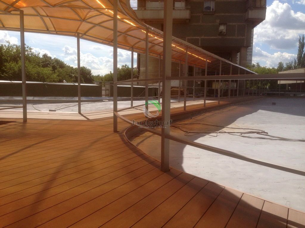 В бизнес-центре на "Войковской" (что на Ленинградском шоссе в Москве) выполнен монтаж переходов между корпусами офисных зданий на кровле. Дорожки выполнены из Универсальной доски из ДПК общей площадью 660 кв.м. Теперь для удобства сотрудников комплекса перейти из одного строения в другие два, занимает не более 1 минуты, а раньше приходилось "путешествовать" по этажам и многочисленным лестничным переходам через первые этажи зданий.